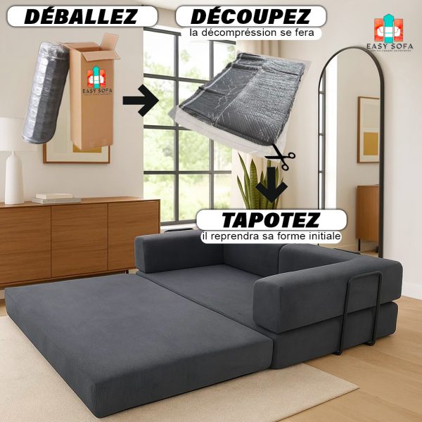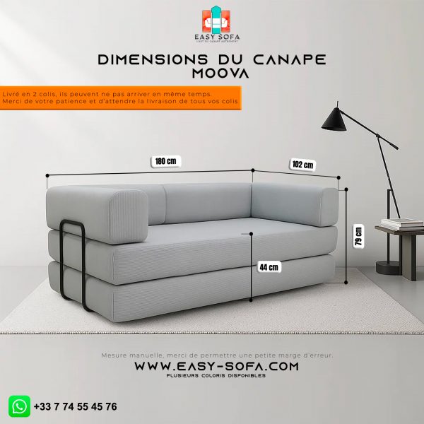 Le MOOVA est un canapé-lit compressé, pratique et élégant. Facile à transporter, rapide à installer, il offre un vrai confort grâce à sa mousse, ses ressorts et sa structure en fer pour un maintien optimal.